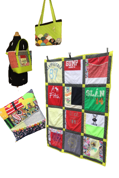"It all began in 2014 when my very good friend lost her daughter, Bethany. I promised her, I would make her a quilt with Bethany’s clothes, but I ended up making two quilts, three cushions, a dog, two handbags and later, a moose! The Tilted Quilt was born!